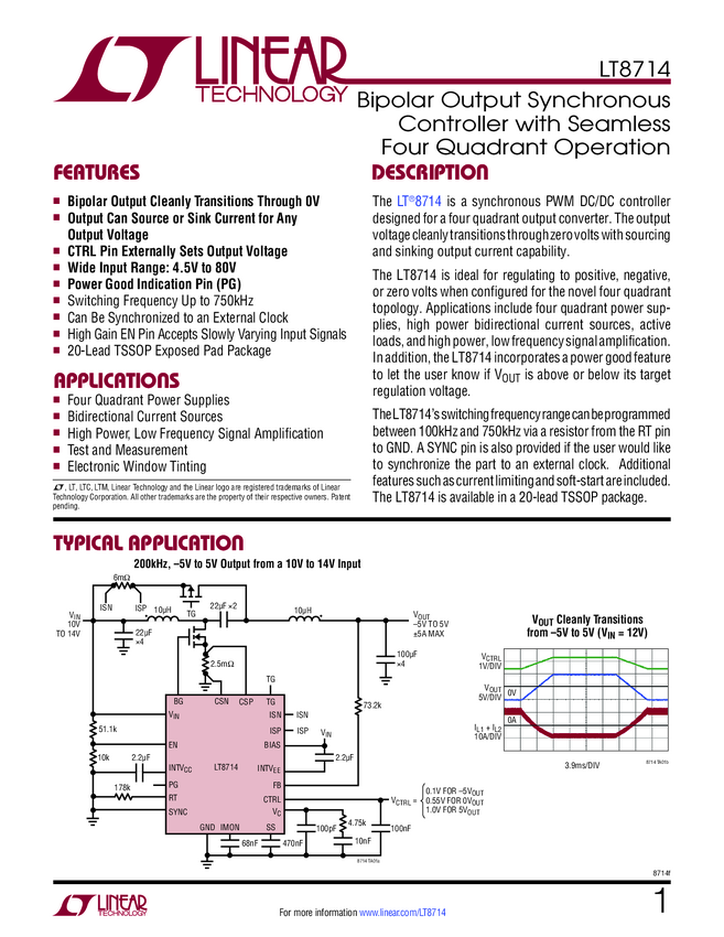 LT8714 Bipolar Output Synchronous Controller with Seamless Four Quadrant Operation