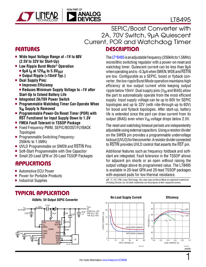 LT8495 SEPIC/Boost Converter with 2A, 70V Switch, 9μA Quiescent Current, POR and W...