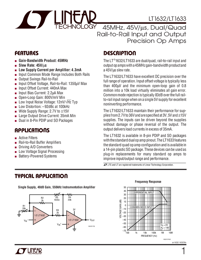 LT1632 45MHz, 45V/µs, Dual Rail-to-Rail Input and Output Precision Op Amps