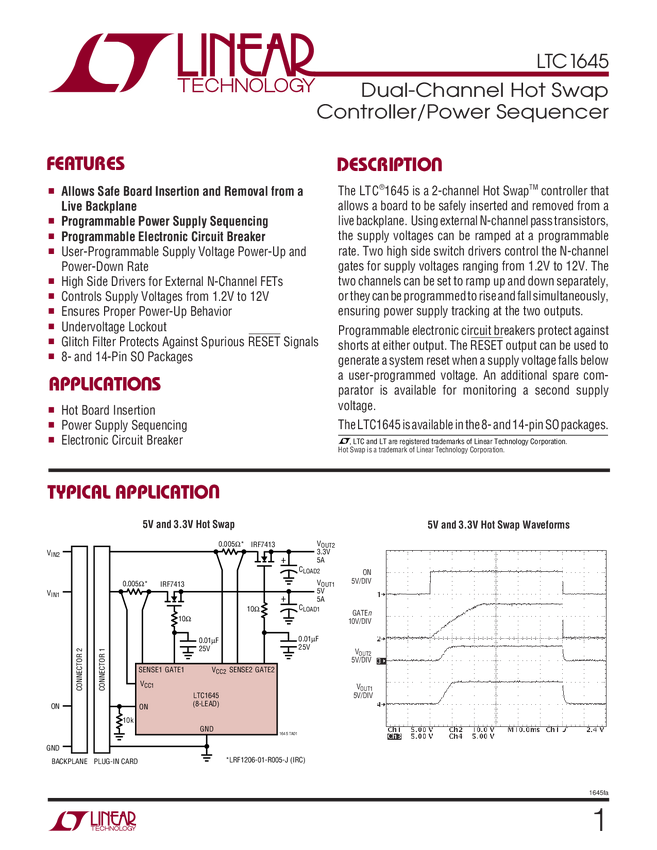 LTC1645 Dual-Channel Hot Swap Controller/Power Sequencer