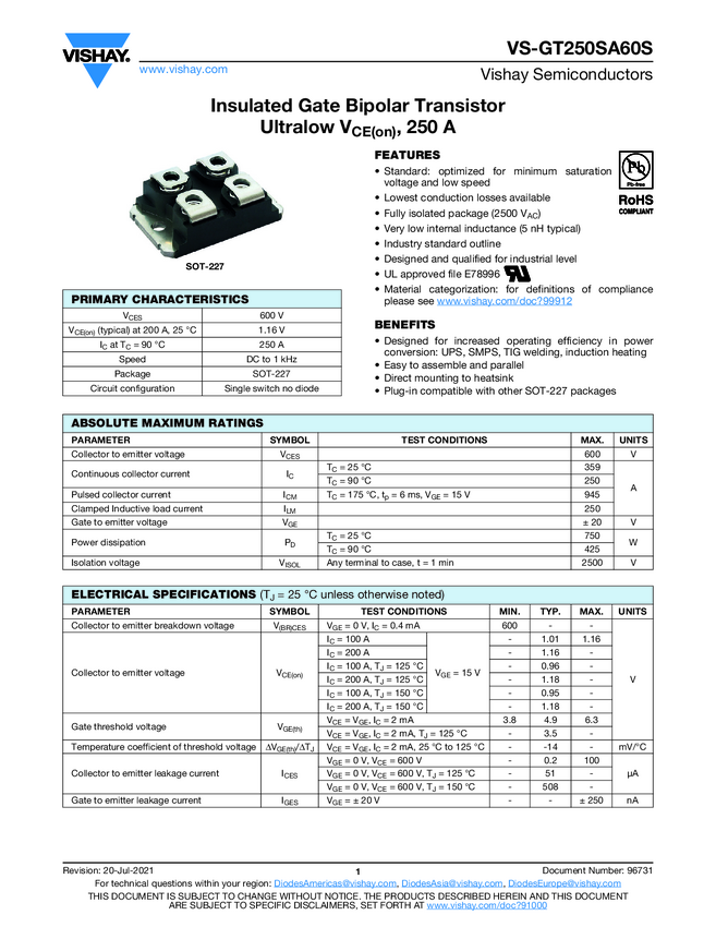 VS-GT250SA60S Insulated Gate Bipolar Transistor Ultralow VCE(on), 250 A