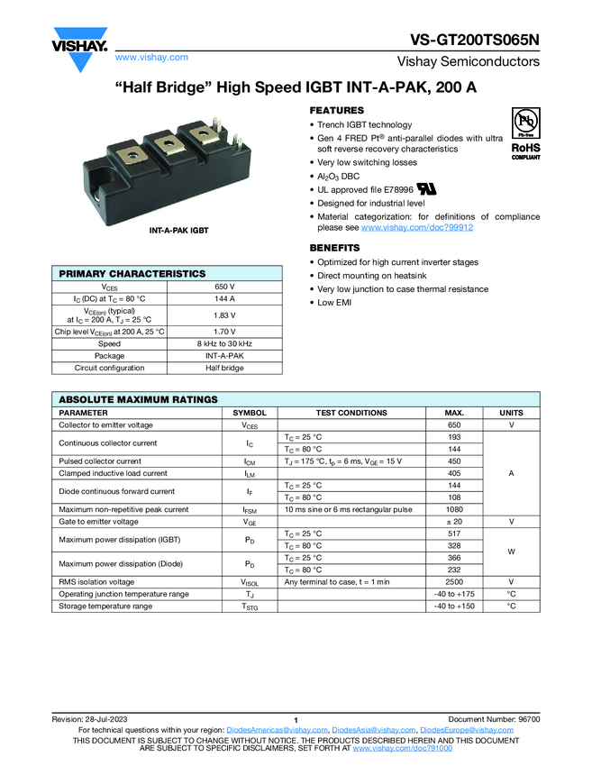 VS-GT200TS065N “Half Bridge” High Speed IGBT INT-A-PAK, 200 A