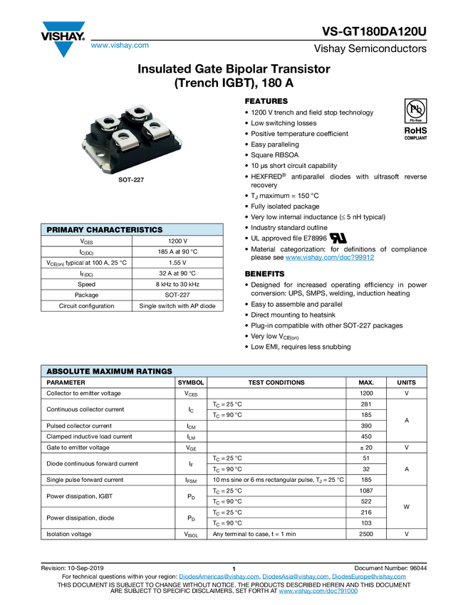 VS-GT180DA120U Insulated Gate Bipolar Transistor (Trench IGBT), 180 A