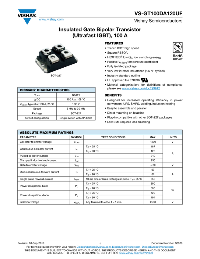 VS-GT100DA120UF Insulated Gate Bipolar Transistor (Ultrafast IGBT), 100 A