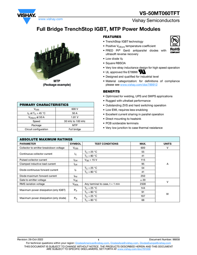 VS-50MT060TFT Full Bridge TrenchStop IGBT, MTP Power Modules