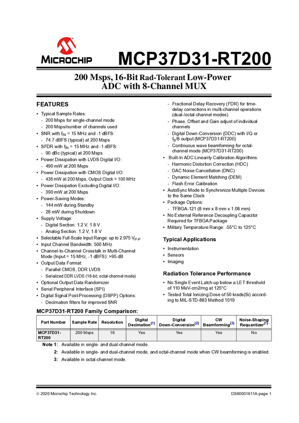 MCP37D31RT MCP37D31-RT200 200 Msps, 16-Bit Rad-Tolerant Low-Power ADC with 8-Channel M...