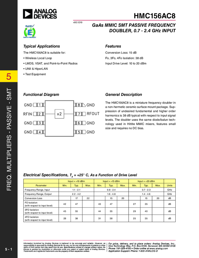 HMC156A Passive frequency doubler chip and surface mount technology (SMT), 0.7 GHz...