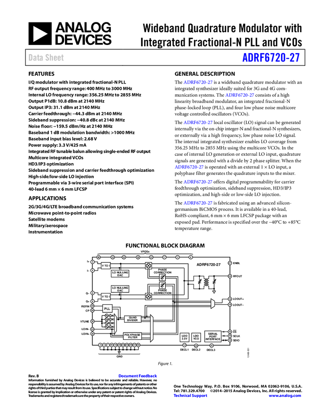 ADRF6720-27 Wideband (400 MHz TO 3 GHz) Quadrature Modulator with Integrated PLL/VCOs a...