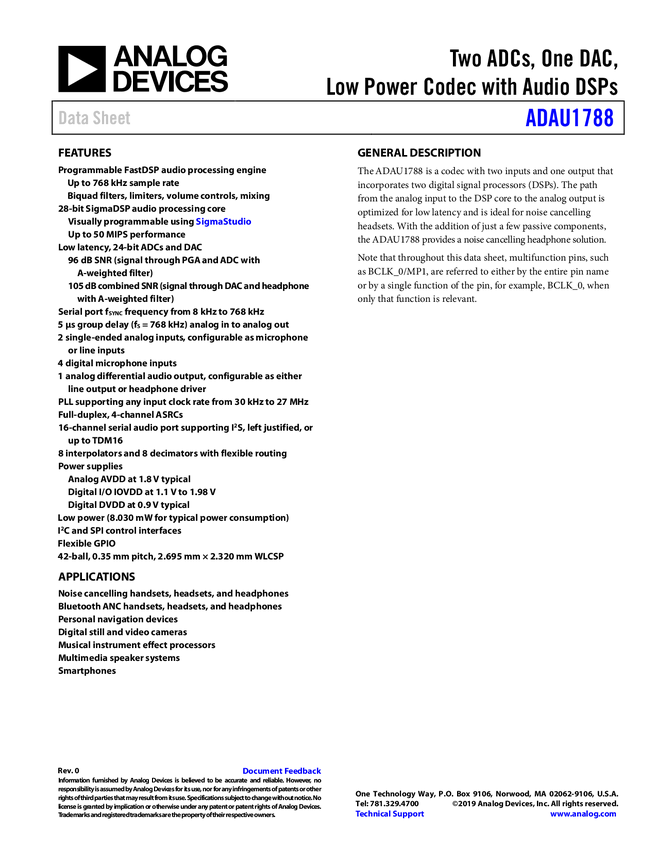 ADAU1788 Two ADCs, One DAC, Low Power Codec with Audio DSPs