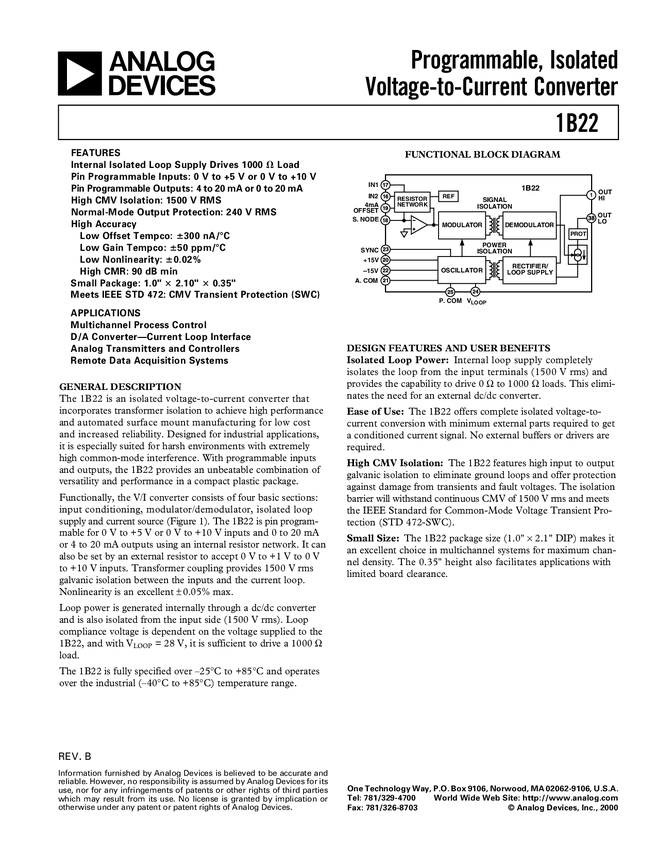 1B22 Programmable, Isolated Voltage-to-Current Converter