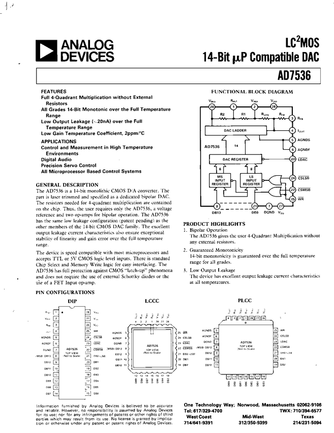 AD7536 14-Bit, Multiplying Iout, 8-bit bus