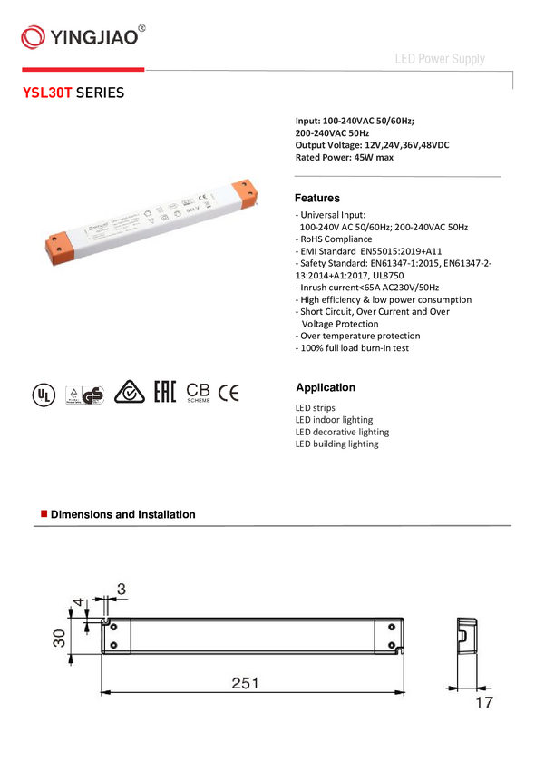 YSL30T-1203750 Zasilacz do oświetlenia LED 12V 3,75A 45W YINGJIAO | YSL30T-1203750