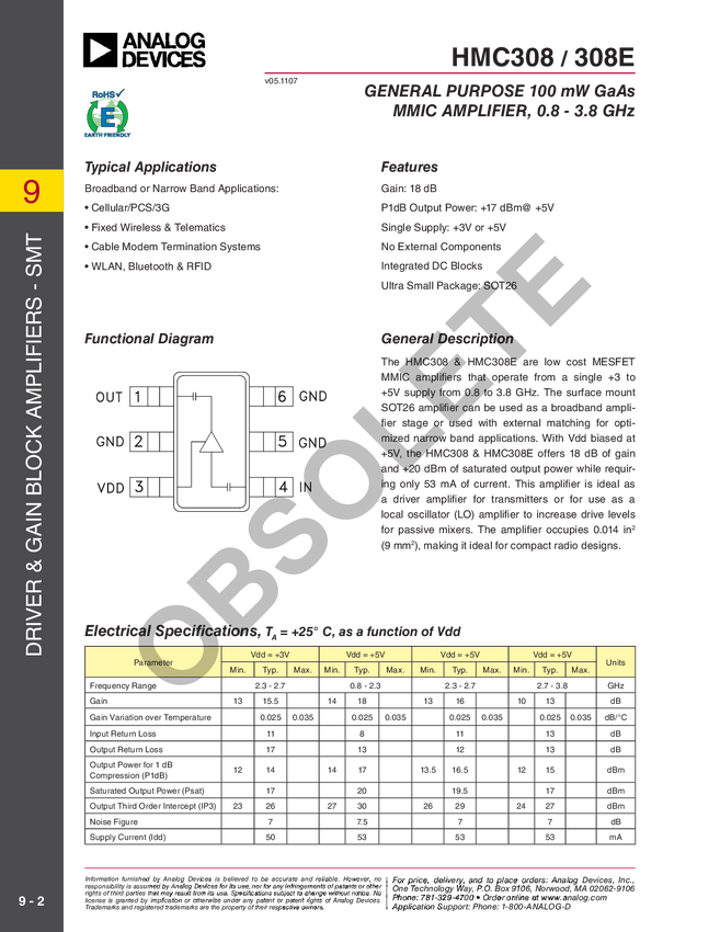 HMC308 General Purpose 100mW Amplifier SMT, 0.8 - 3.8 GHz