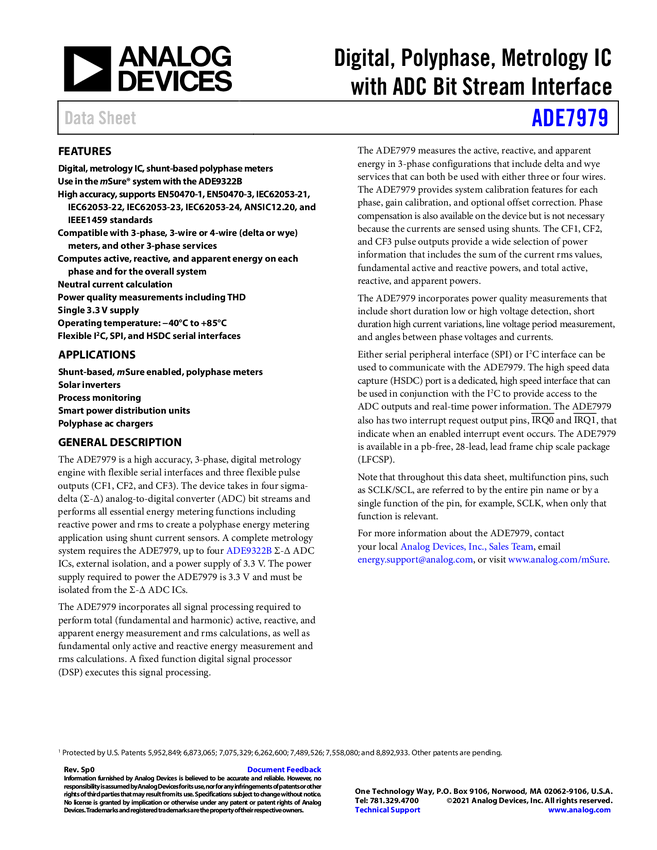 ADE7979 Digital, Polyphase, Metrology IC with ADC Bit Stream Interface
