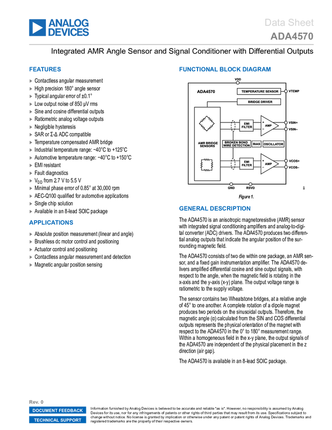 ADA4570 Integrated AMR Angle Sensor and Signal Conditioner with Differential Output...