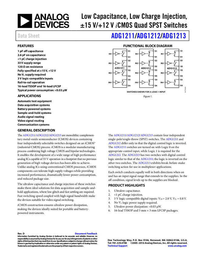 ADG1212 Low Capacitance, Low Charge Injection, ±15 V/+12 V iCMOS Quad SPST Switch