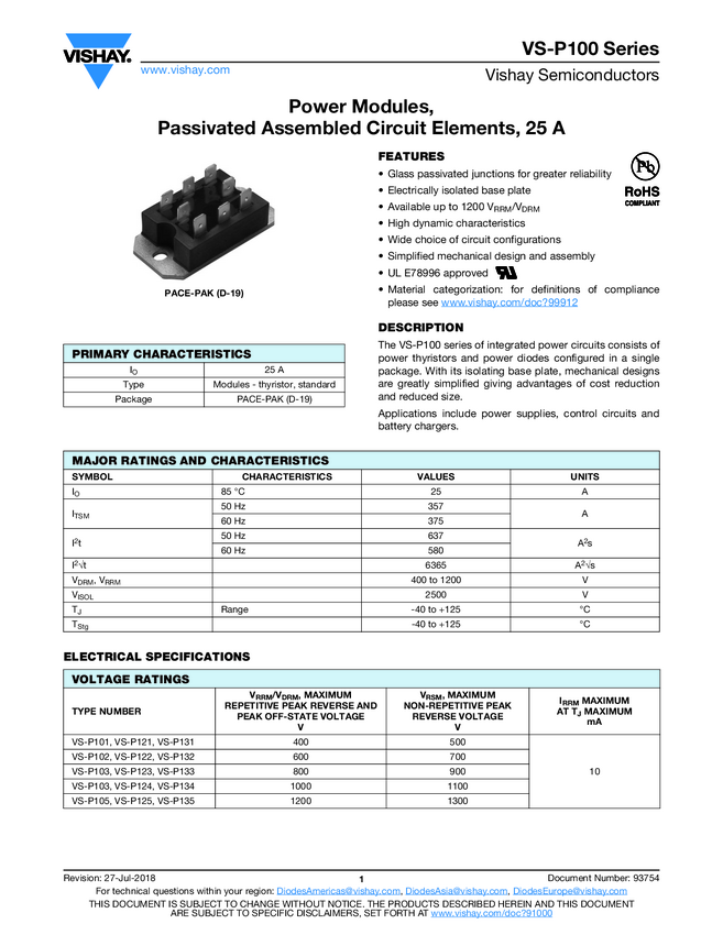 VS-P100 Series Single Phase Bridge, Passivated Assembled Circuit Elements, 25 A