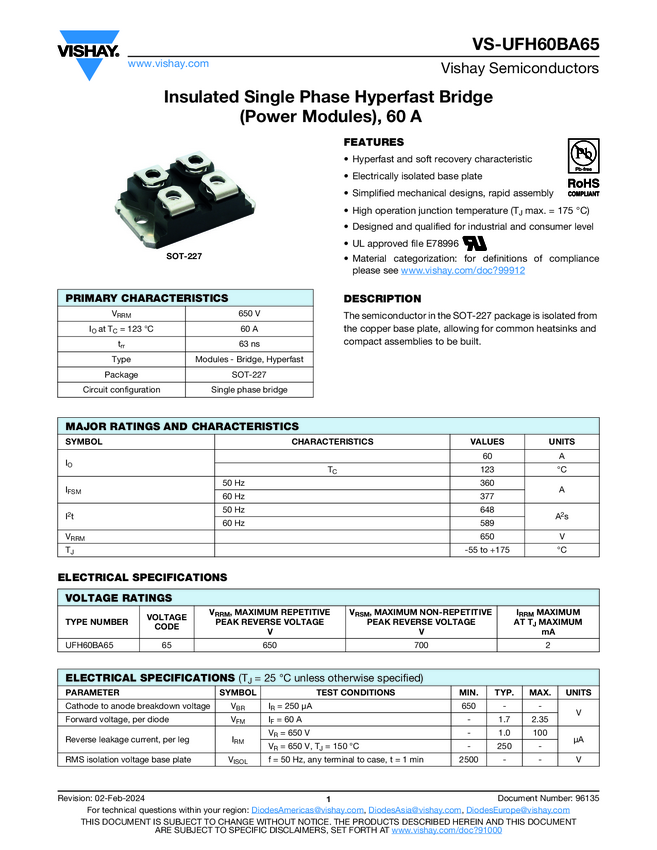 VS-UFH60BA65 Insulated Single Phase Hyperfast Bridge (Power Modules), 60 A
