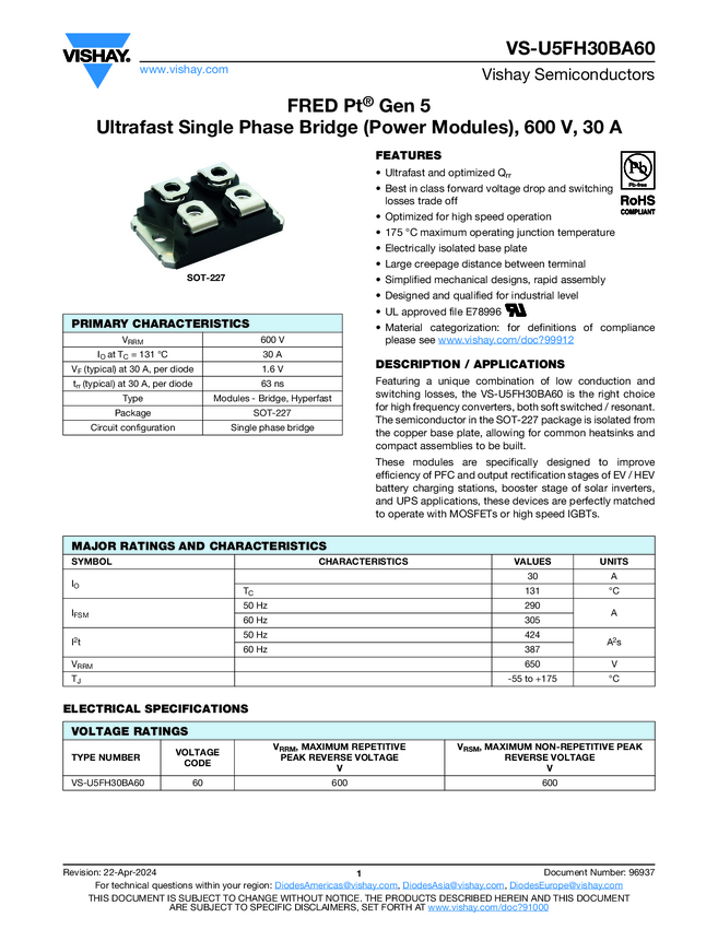 VS-U5FH30BA60 FRED Pt® Gen 5 Ultrafast Single Phase Bridge (Power Modules), 600 V, 3...