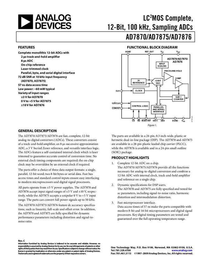 AD7876 CMOS, Complete 12-bit, 100 H, Sampling ADC with ±10V Input Signal Range