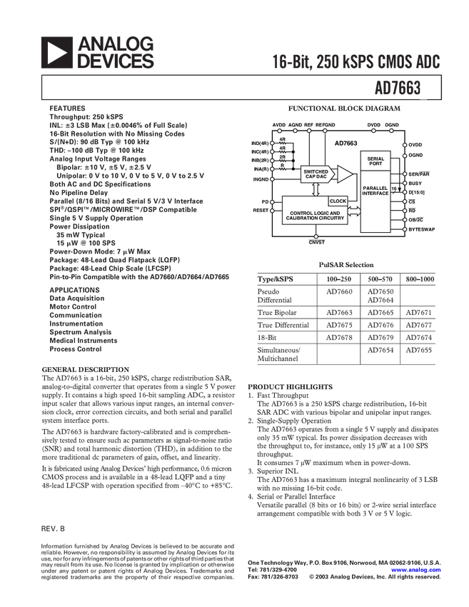 AD7663 16-Bit Bipolar 250 kSPS PulSAR CMOS ADC