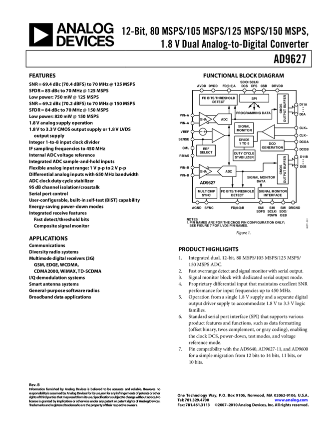 AD9627 12-Bit, 80 MSPS/105 MSPS/125 MSPS/150 MSPS, 1.8 V Dual Analog-to-Digital Co...