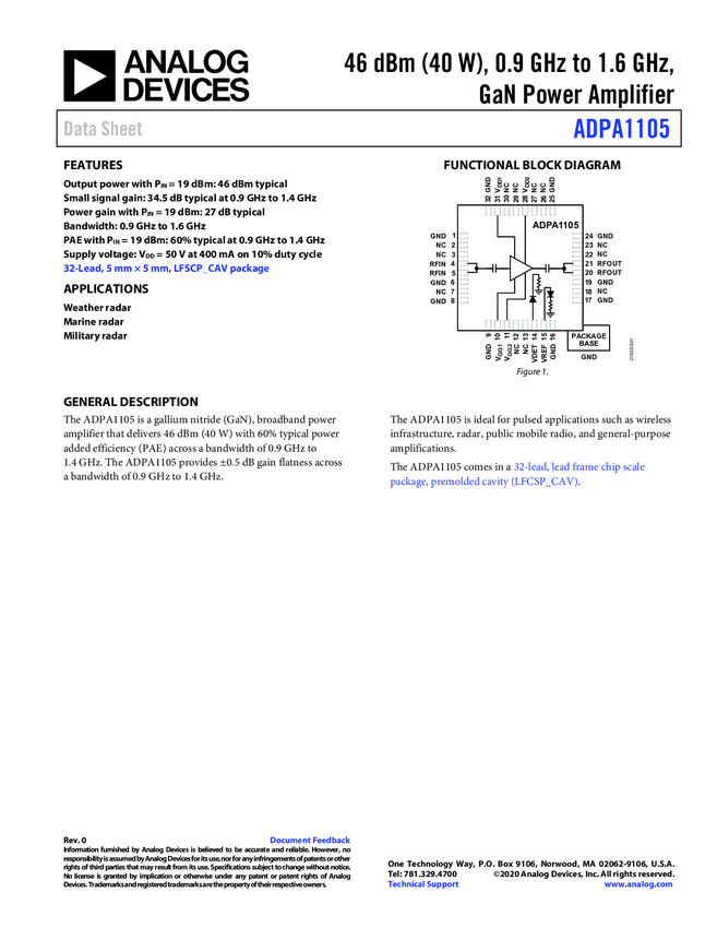 ADPA1105 46 dBm (40 W), 0.9 GHz to 1.6 GHz, GaN Power Amplifier
