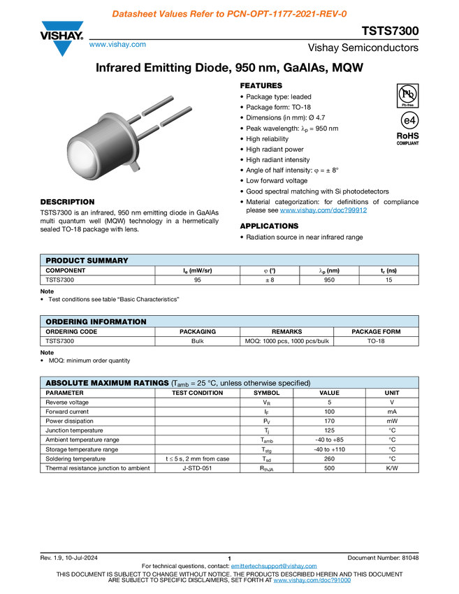 TSTS7300 Infrared Emitting Diode, 950 nm, GaAlAs, MQW