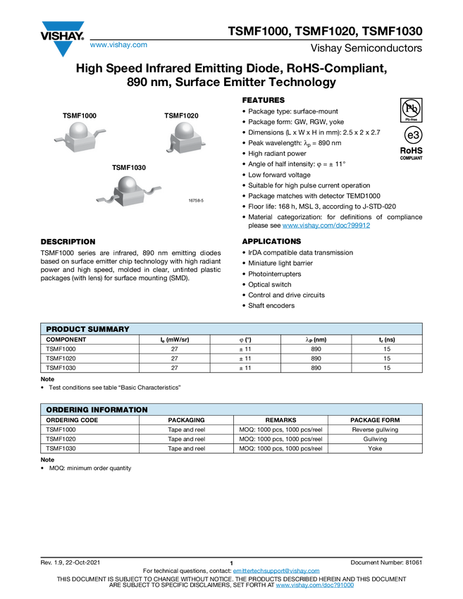TSMF1030 High Speed Infrared Emitting Diode, RoHS-Compliant, 890 nm, Surface Emitter...