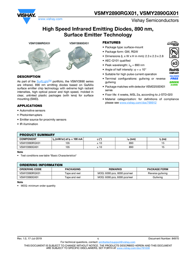 VSMY2890RGX01 High Speed Infrared Emitting Diodes, 890 nm, Surface Emitter Technology