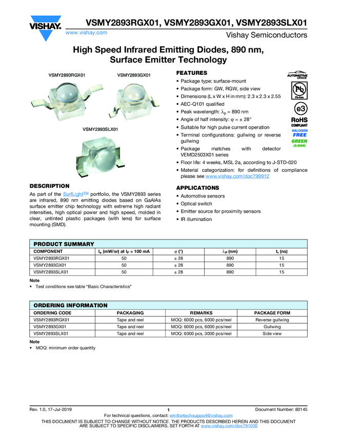 VSMY2893SLX01 High Speed Infrared Emitting Diodes, 890 nm, Surface Emitter Technology