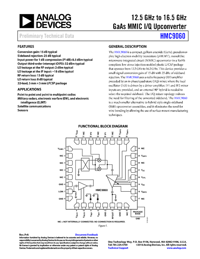 HMC9060 12.5 GHz to 16.5 GHz GaAs MMIC I/Q Upconverter