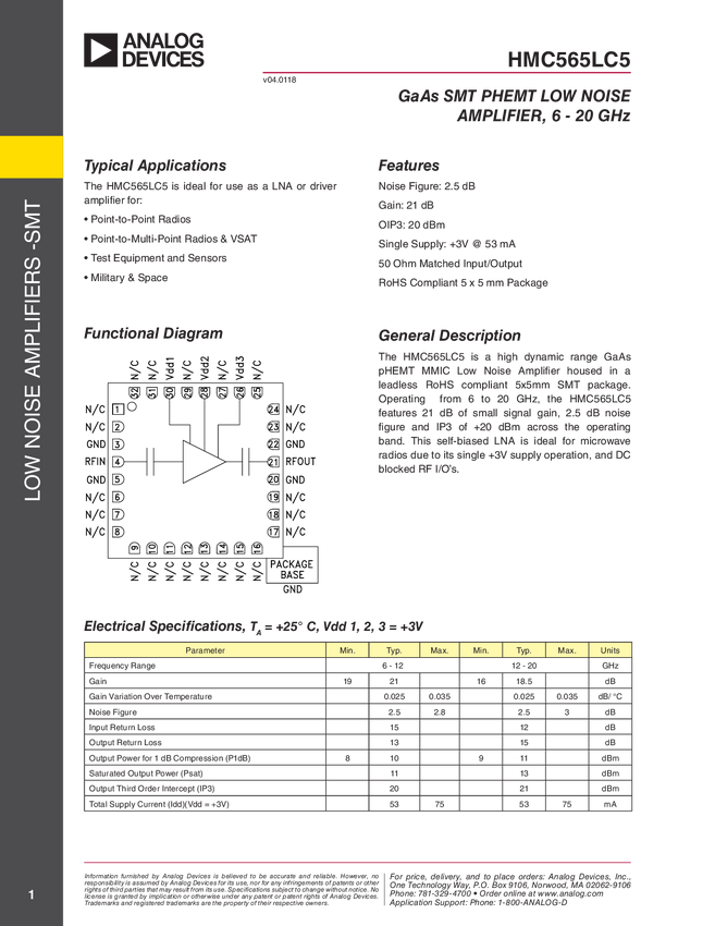 HMC565LC5 Low Noise Amplifier SMT, 6 - 20 GHz