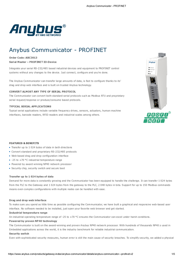 ABC3013 Konwerter szeregowy Anybus ABC3013 RS-485, RS-232, Modbus-RTU, Profinet