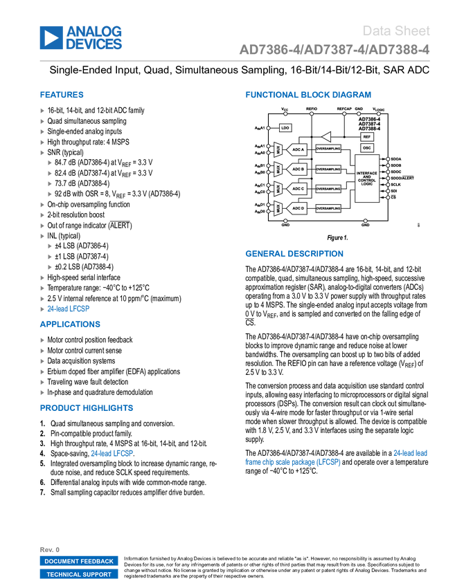AD7386-4 Single-Ended Input, Quad, Simultaneous Sampling, 16-Bit/14-Bit/12-Bit, SAR...