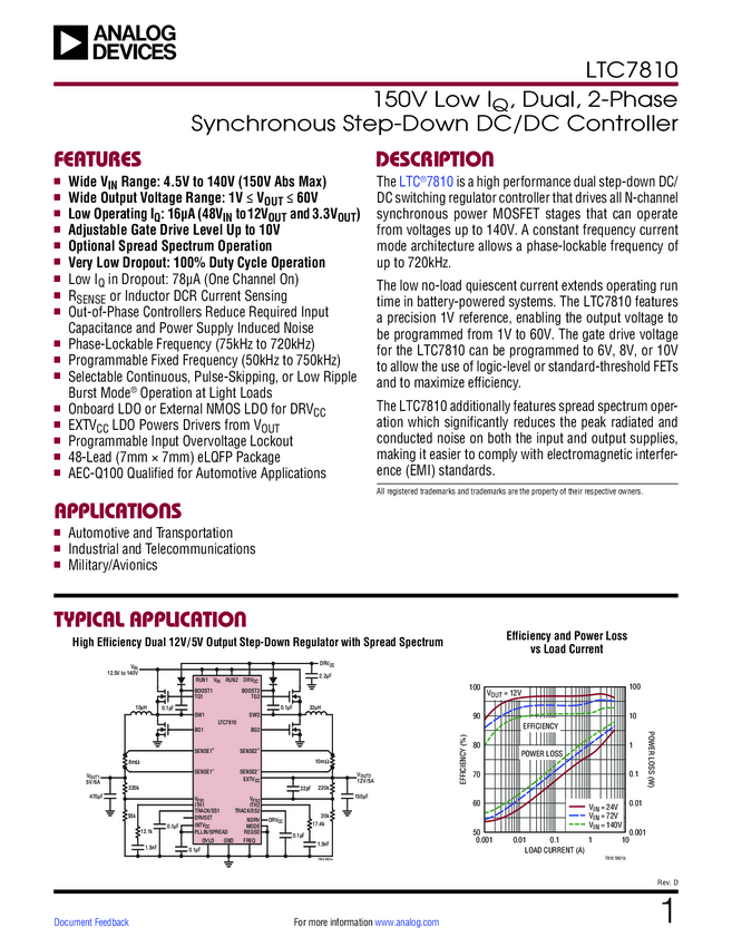 LTC7810 150V Low I, Dual, 2-Phase Synchronous Step-Down DC/DC Controller