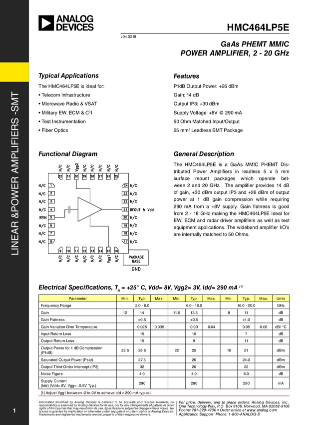 HMC464LP5 Wideband Power Amplifier SMT, 2 - 20 GHz