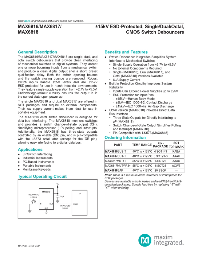 MAX6816 ±15kV ESD-Protected, Single/Dual/Octal, CMOS Switch Debouncers