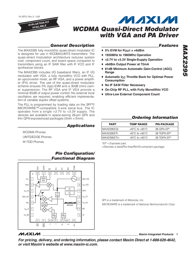 MAX2395 WCDMA Quasi-Direct Modulator with VGA and PA Driver