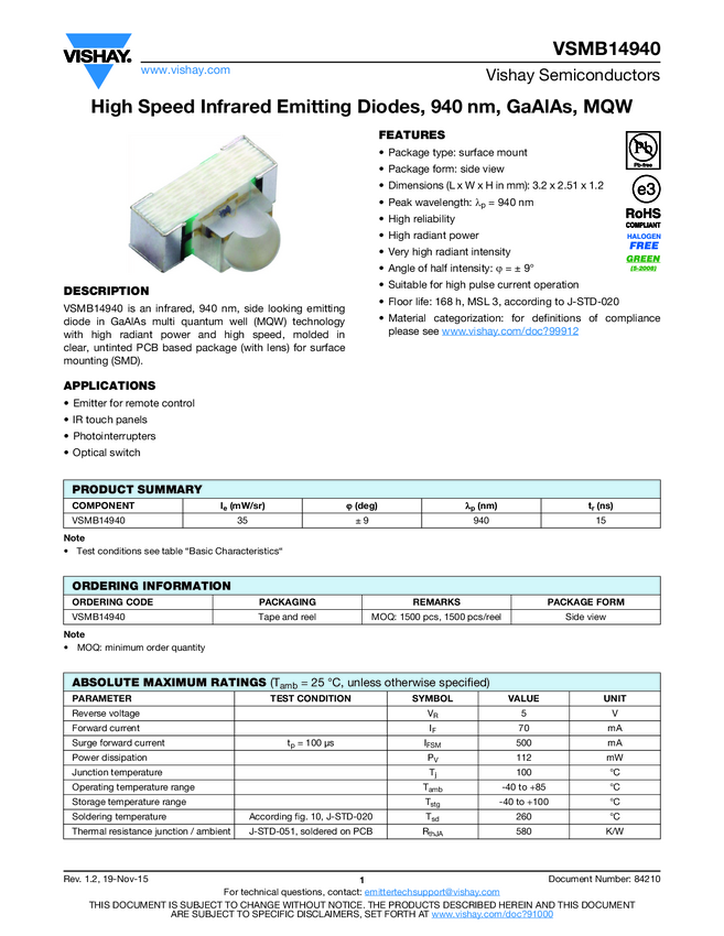 VSMB14940 High Speed Infrared Emitting Diodes, 940 nm, GaAlAs, MQW
