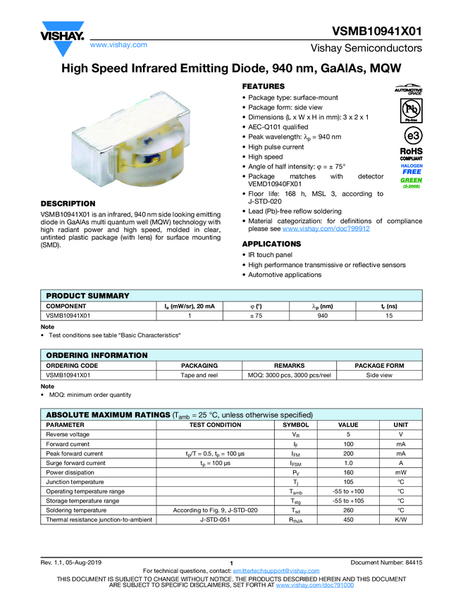 VSMB10941X01 High Speed Infrared Emitting Diode, 940 nm, GaAlAs, MQW