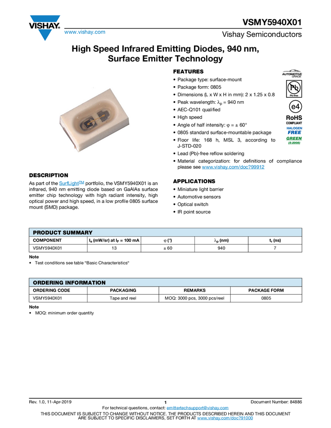VSMY5940X01 High Speed Infrared Emitting Diodes, 940 nm, Surface Emitter Technology
