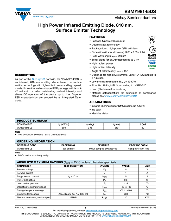 VSMY98145DS High Power Infrared Emitting Diode, 810 nm, Surface Emitter Technology