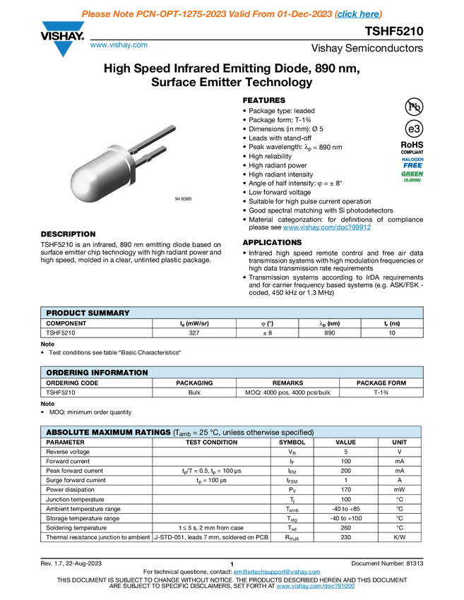TSHF5210 High Speed Infrared Emitting Diode, 890 nm, Surface Emitter Technology