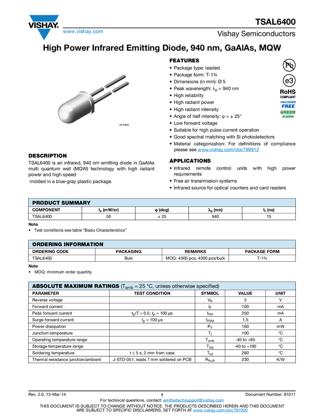 TSAL6400 High Power Infrared Emitting Diode, 940 nm, GaAlAs, MQW