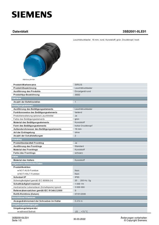 3SB20010LE01 Siemens 3SB20010LE01 Siemens Dig.Industr. Przycisk podświetlany pierścień...