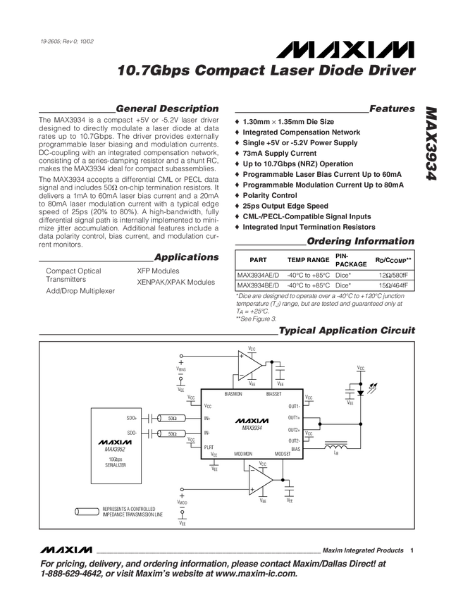 MAX3934 10.7Gbps Compact Laser Diode Driver