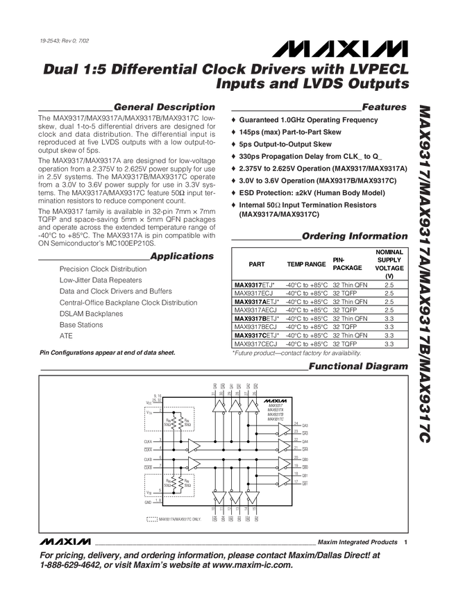 MAX9317A Dual 1:5 Differential Clock Drivers with LVPECL Inputs and LVDS Outputs