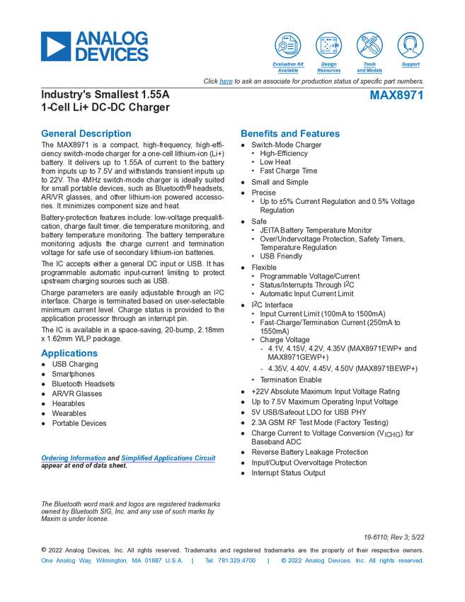MAX8971 Industry's Smallest 1.55A 1-Cell Li+ DC-DC Charger