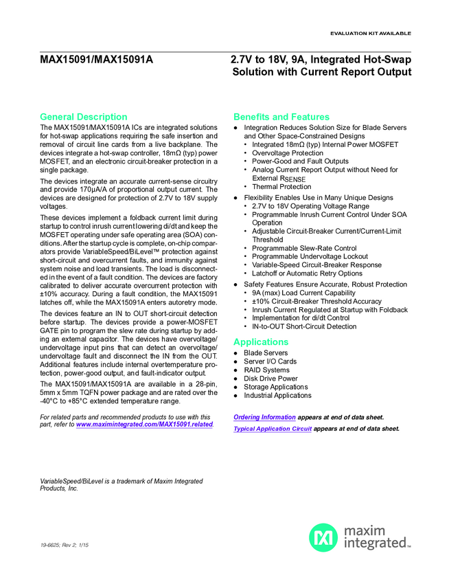 MAX15091A 2.7V to 18V, 9A, Integrated Hot-Swap Solution with Current Report Output